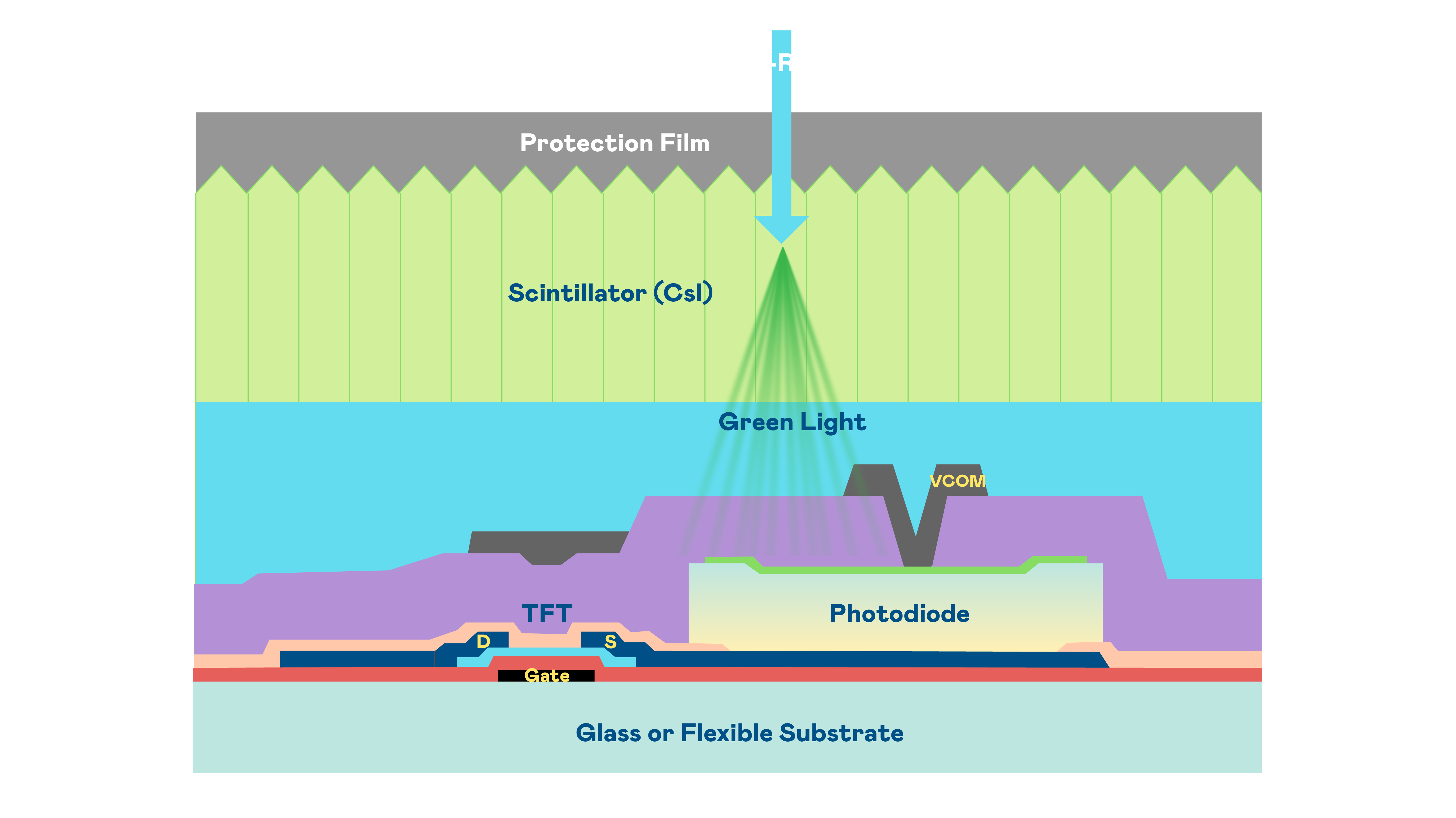 华体汇官网登录入口的X光影像感測陣列使用薄膜電晶體 (TFT) 作為每個像素的讀取開關,搭配光電二極體(Photodiode)的光電轉換元件,用以感測X光影像訊號。